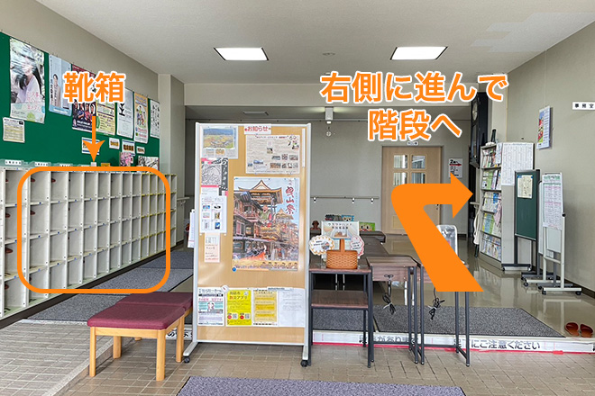 その③正面玄関を入ったところです。左側の靴箱に靴を入れ、スリッパに履き替えて、向かって右側に進んだところにある階段を昇ってください。サロンとして使用している児童室の前に着きます。